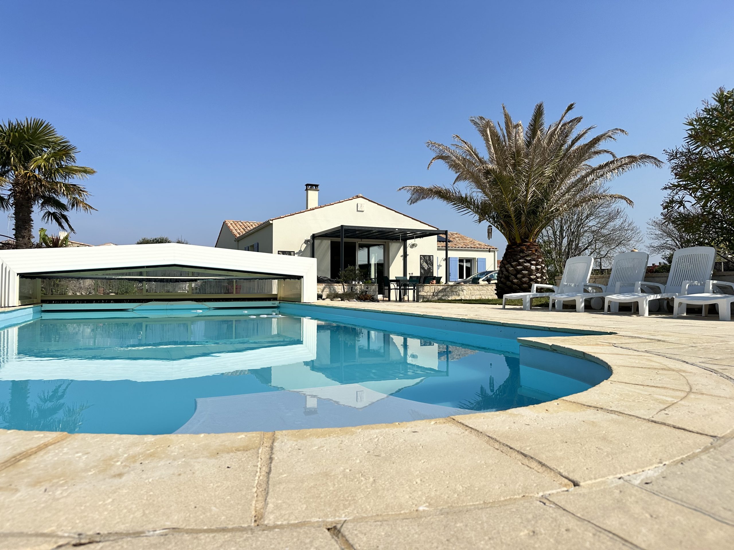 Dès l’entrée, un vaste hall agrémenté de rangements intégrés dévoile des volumes généreux et une distribution harmonieuse. Il mène à une cuisine entièrement équipée, aux lignes soignées et à l’agencement optimisé, pensée pour répondre aux exigences des amateurs de gastronomie. Dans son prolongement, la pièce de vuie baignée de lumière accueille un salon chaleureux sublimé par une cheminée avec insert, créant une atmosphère à la fois conviviale et raffinée. Cet espace s’ouvre naturellement sur une pergola bioclimatique, véritable écrin de transition entre intérieur et extérieur, propice à la détente en toute saison.