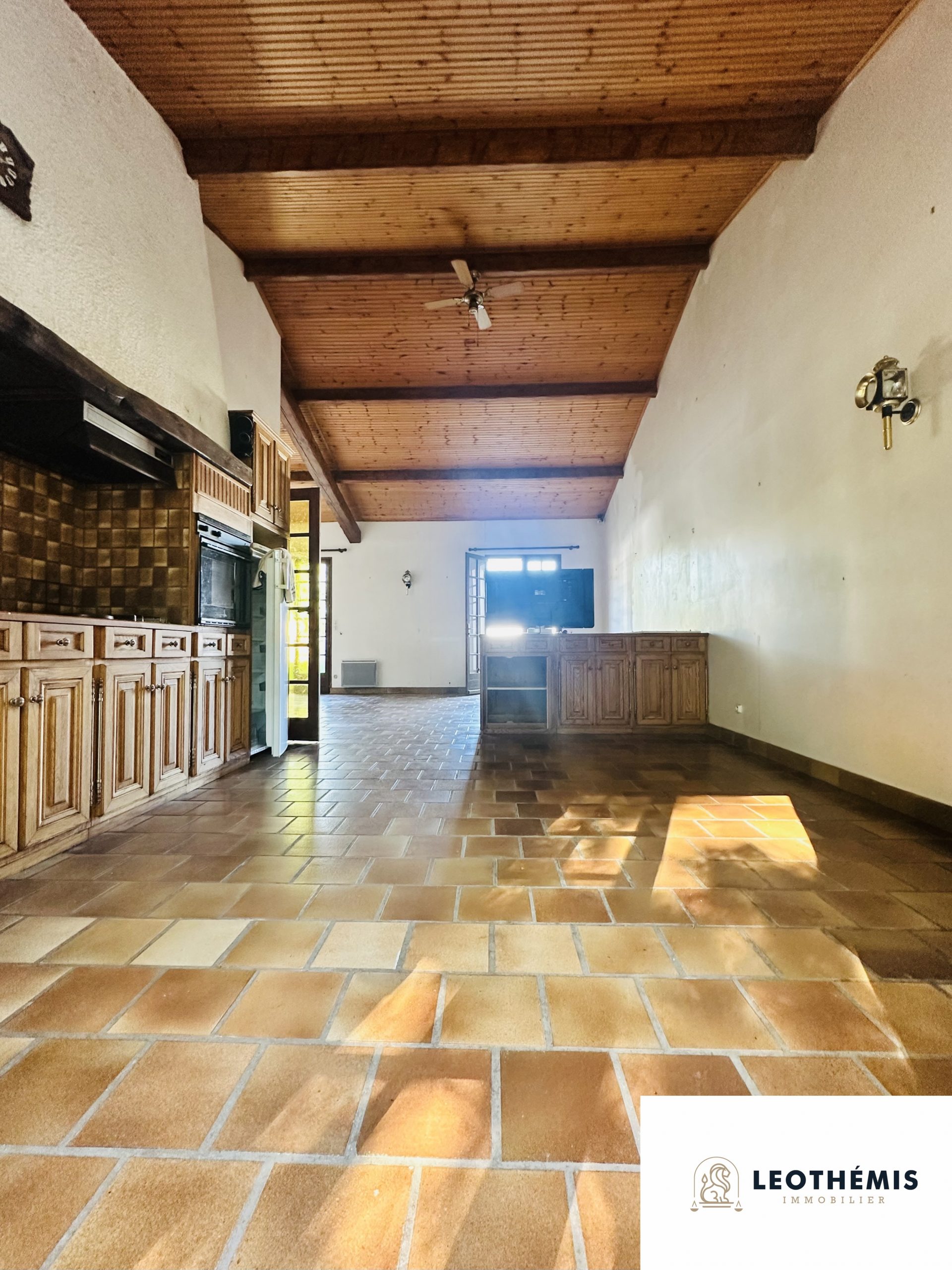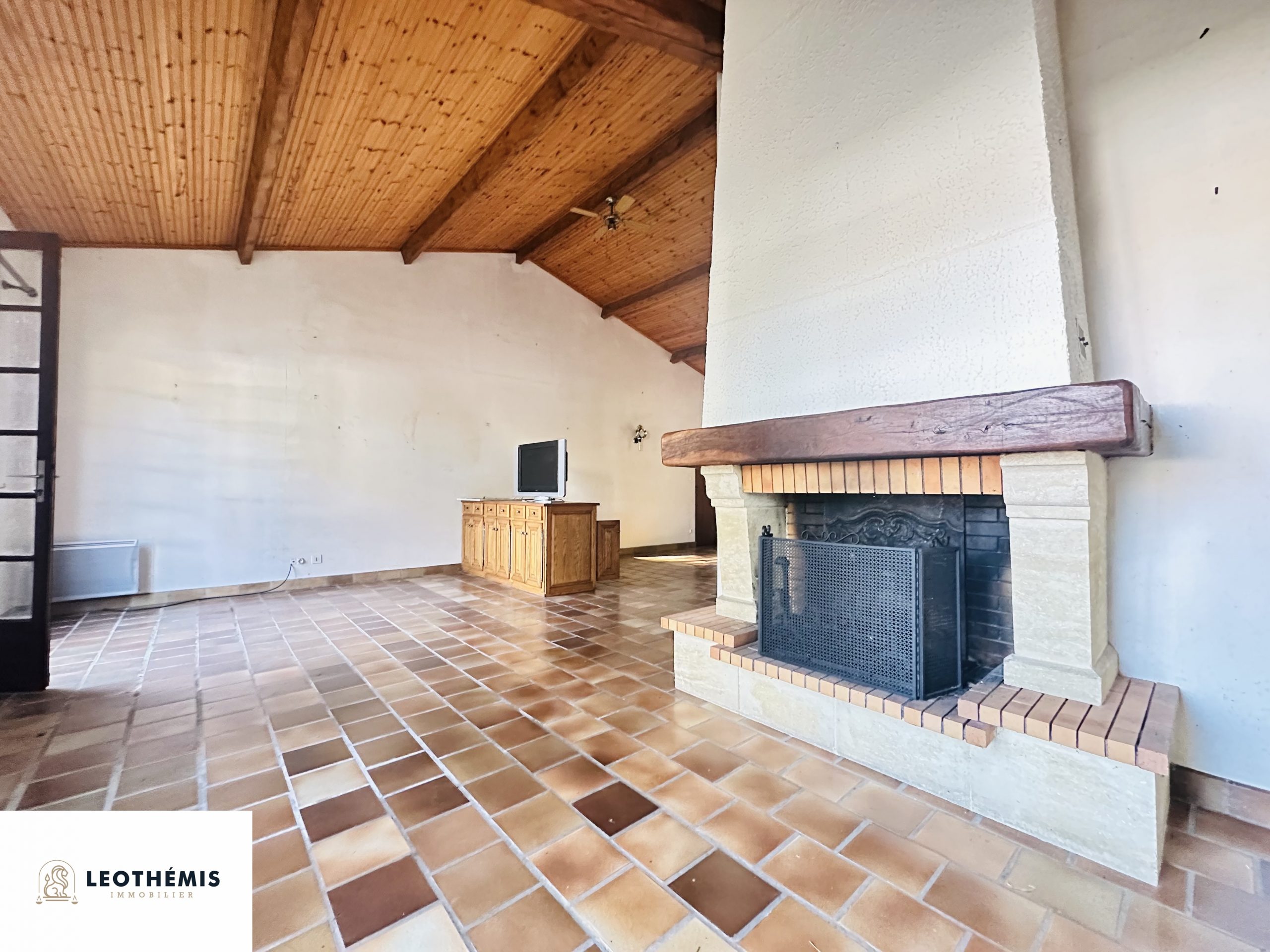 La maison se compose d’une entrée donnant sur une pièce de vie lumineuse et traversante avec sa cheminée et sa très belle hauteur sous plafond, une cuisine ouverte aménagée et équipée tournée vers le jardin.